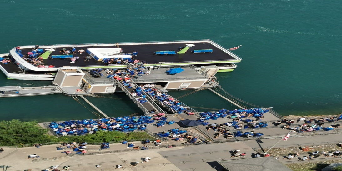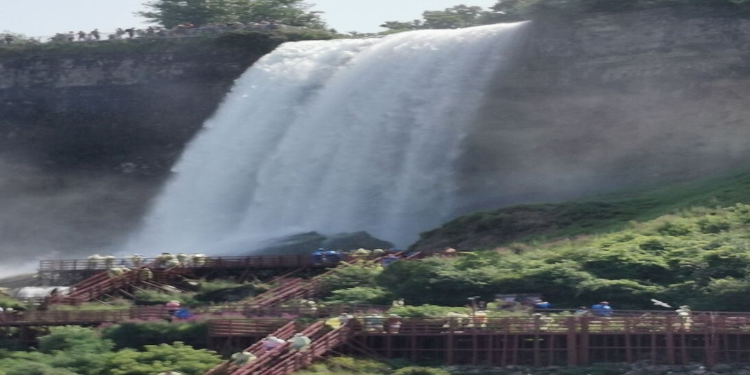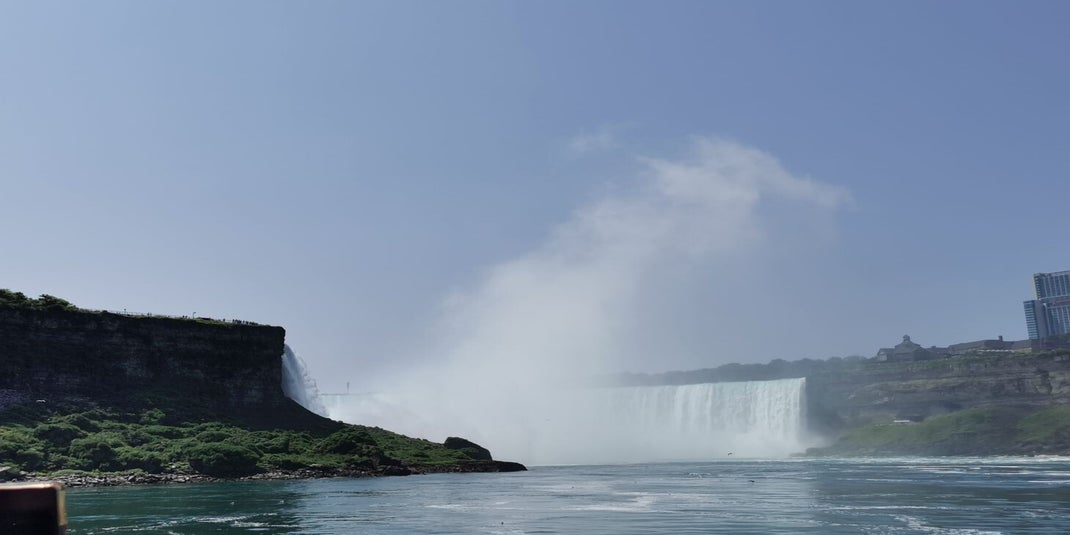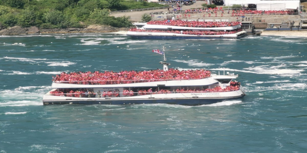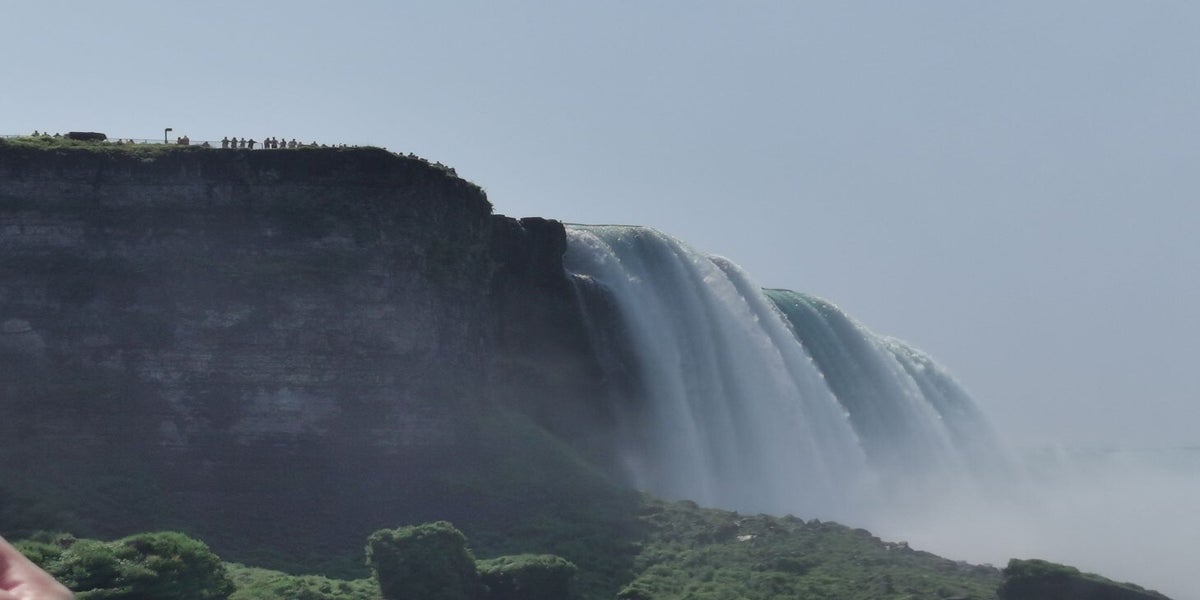 Jeder bekommt eine beschriftete Mülltüte übergezogen. Die US-Amerikaner blaue und die Kanadier rote. Wir können nicht nach Kanada, da wir kein Visum haben. Die kanadische Seite soll deutlich schöner sein. Da wir aber mit dem Boot auch auf die kanadische Seite fahren, bekommen wir einen kleinen Eindruck der großen Eindruck macht. Die Mülltüten werden danach entsorgt ... tausende pro Monat. Naja ...